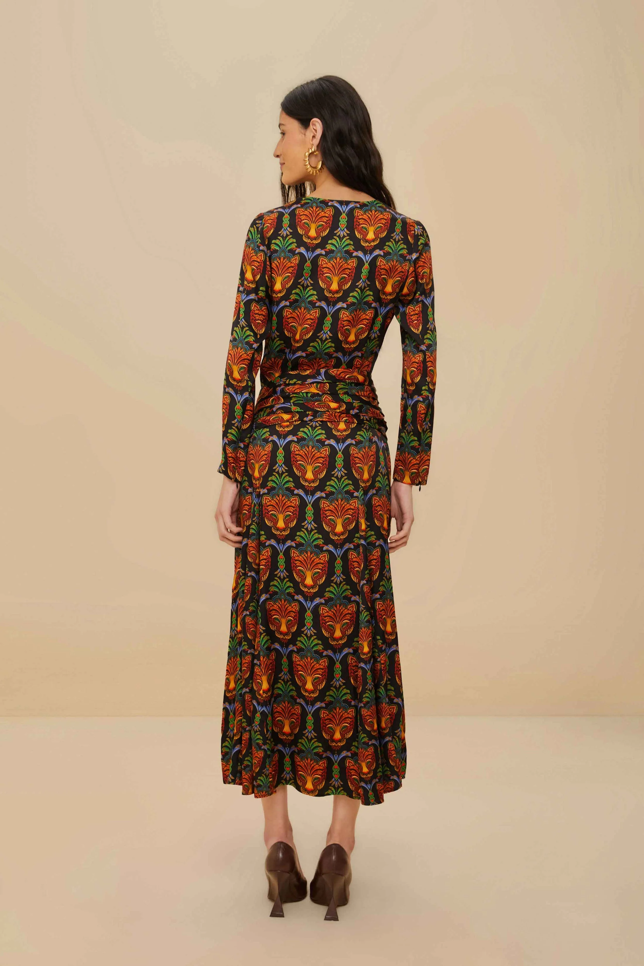 The Black Boho Panther Viscose Midi Dress enchants with its bold panther pattern and rich earthy tones. The fluid silhouette cascades gracefully to a midi length, accentuated by an artful wrap detail. Its round neckline and long sleeves bring an air of relaxed elegance. Crafted from responsible materials, this dress captures a playful spirit while ensuring effortless comfort and unique style.