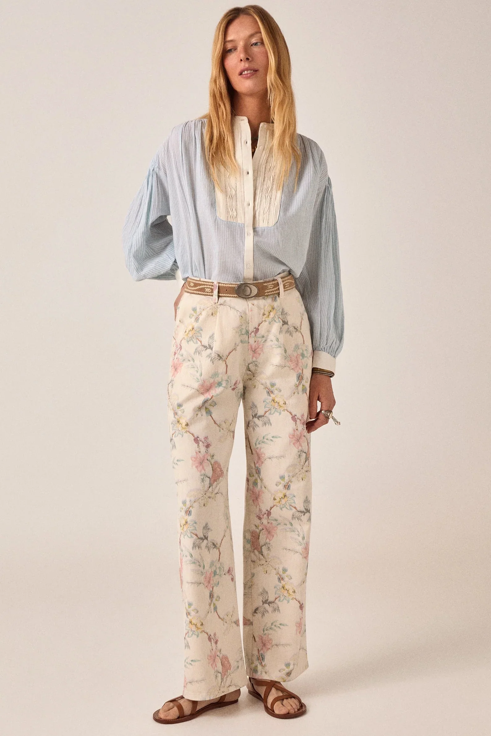 The body is soft light blue with white pinstripes—classic shirting stripe. The yoke panel at the chest and cuffs are cream with vertical embroidered lines, like a traditional men's dress shirt adapted. The mix of cotton stripe and embroidered cotton-viscose gives it texture without trying too hard.