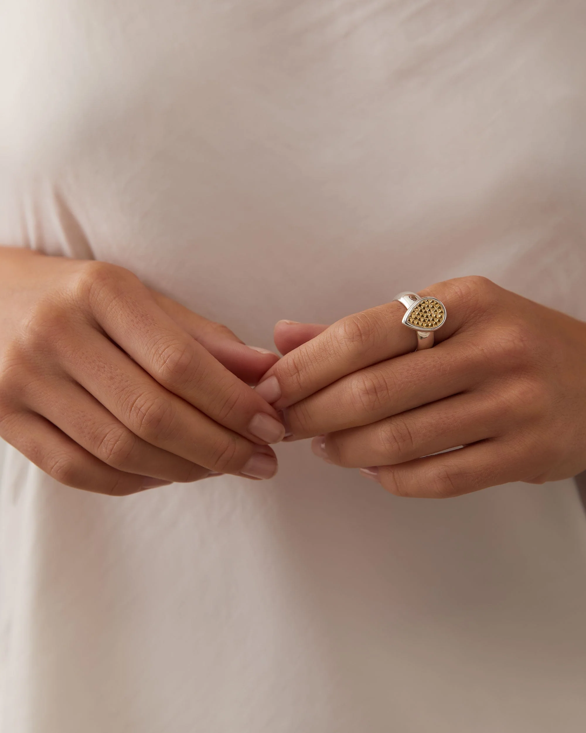 Modern meets classic: Traditional Balinese gold dotting in our signature teardrop shape, paired with a smooth, rounded silver band. Great in your favorite stack.