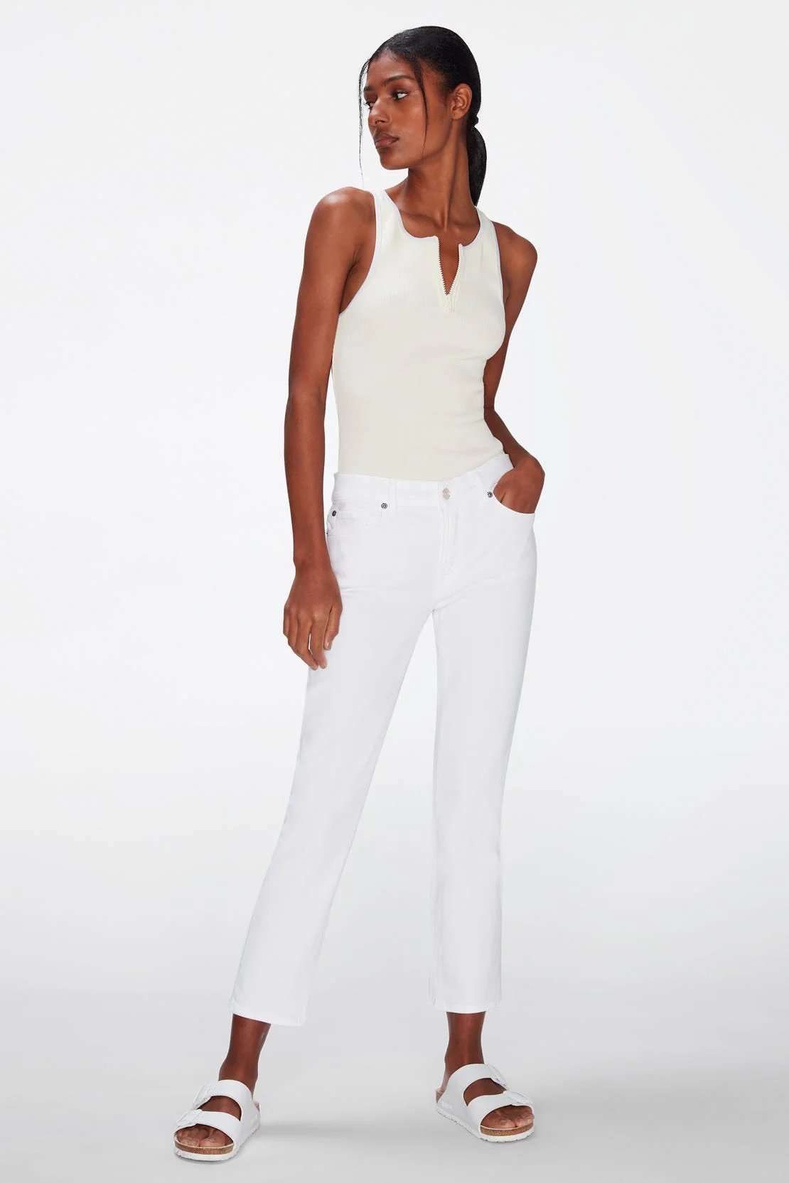 White denim is a summer essential and the Roxanne Ankle jeans will equip you stylishly for seasons to come. They're crafted from white Luxe Vintage denim – distinguished by softness, stretch and an authentic look – to a mid-rise, cropped, skinny silhouette. Style with a tank, denim jacket and leather slides. 7 For All Mankind jeans are made from premium-quality fabrics.