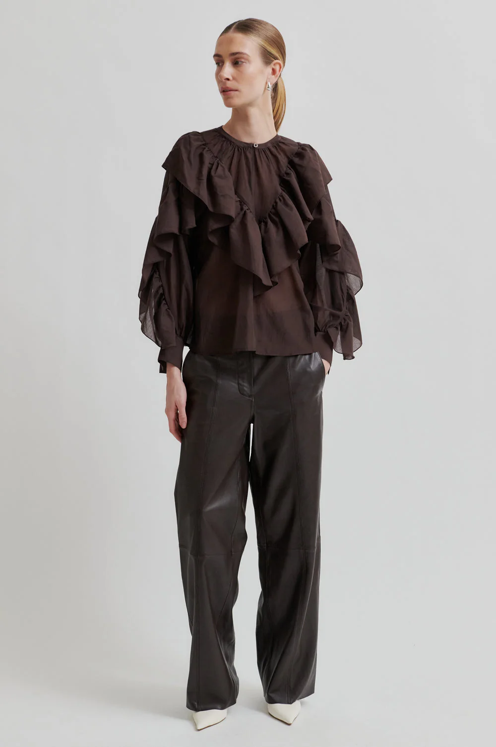 Second Female frill blouse. The blouse is made in lightweight, semi-sheer fabric. Featuring a keyhole opening with button fastening at the front. Diagonal frills at front and sleeves. Long sleeves with buttoned cuffs. Relaxed, airy fit.