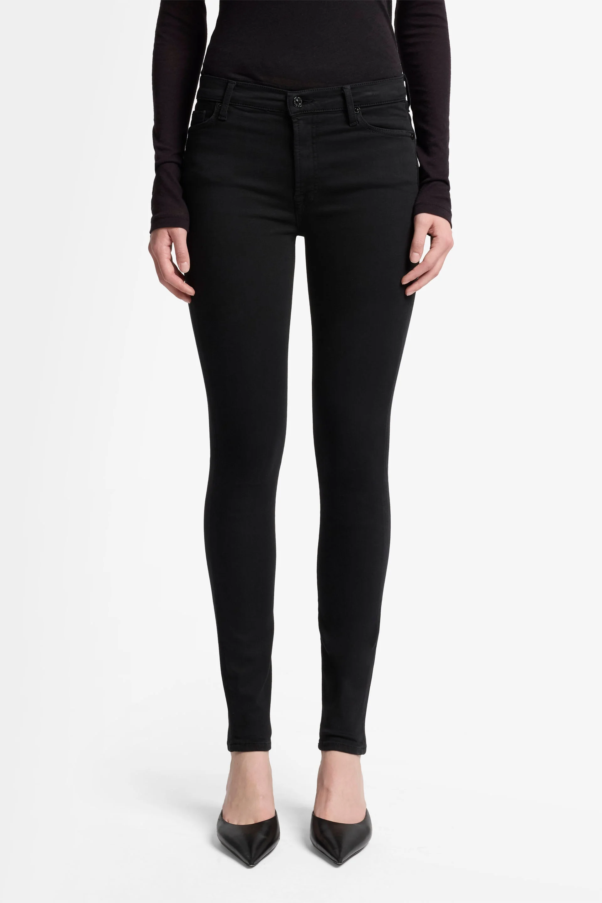7 For All Mankind’s High Waist, Skinny jeans in Slim Illusion Luxe Rinsed Black denim are an essential must-have. Luxe stretch denim is created using innovative denim technology with a slimming fit that moulds and moves with you. The black High Waist Skinny is a timeless style staple with a luxurious, soft hand feel. An indispensable black pant with versatile appeal.