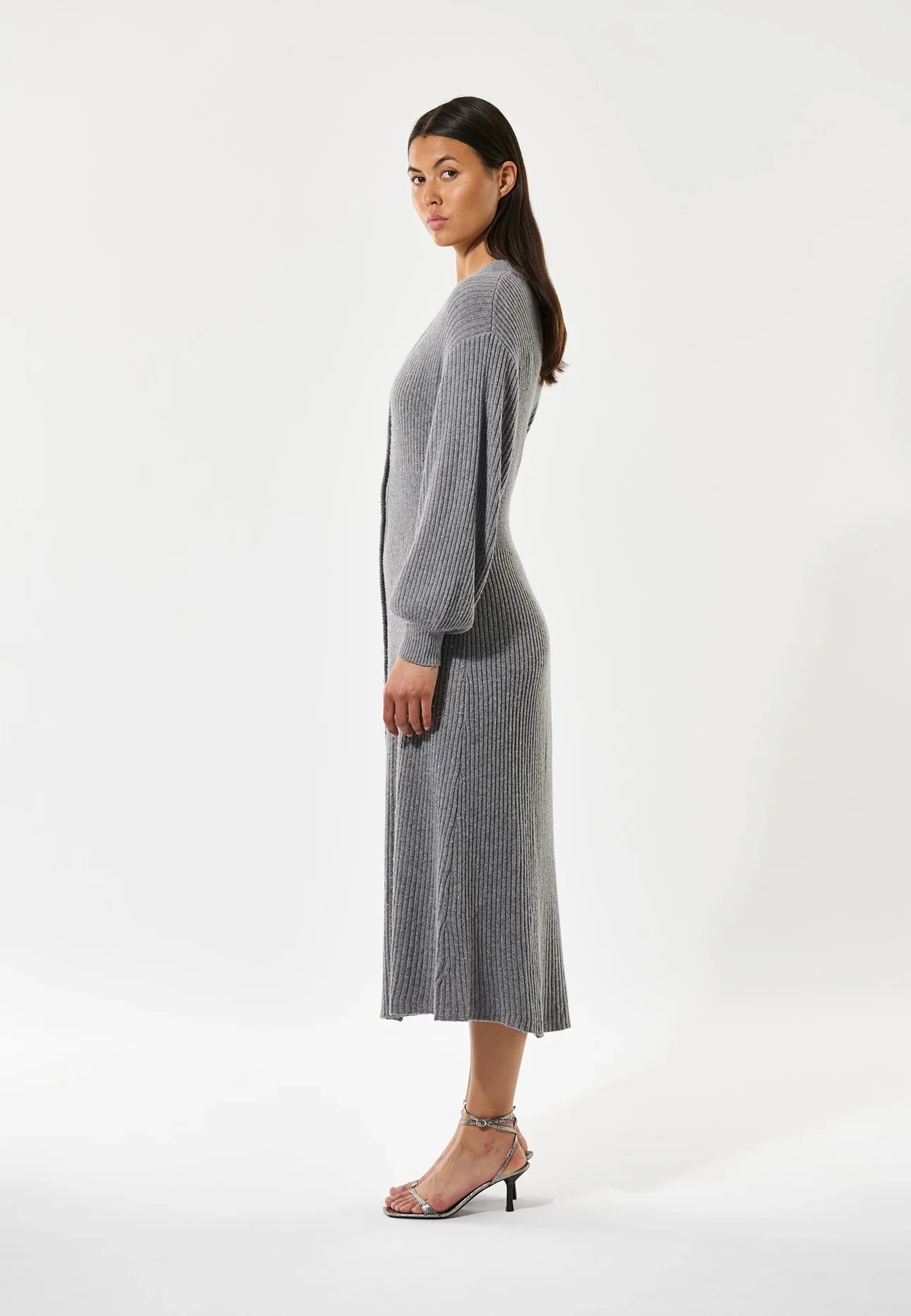 Long and lean, this luxurious grey knitted dress is fitted on the body before flaring gently to fall to ankle length. Made from a soft wool mix yarn, the dress has a deep V neck, ribbed detail at the waist and cuffs and is buttoned down the front with textured metallic buttons.