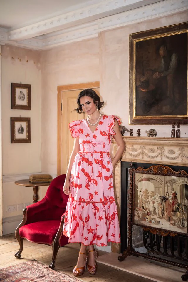 The Misha Dress features a striking lobster and starfish print in warm pink and red tones, perfect for adding personality to your wardrobe.