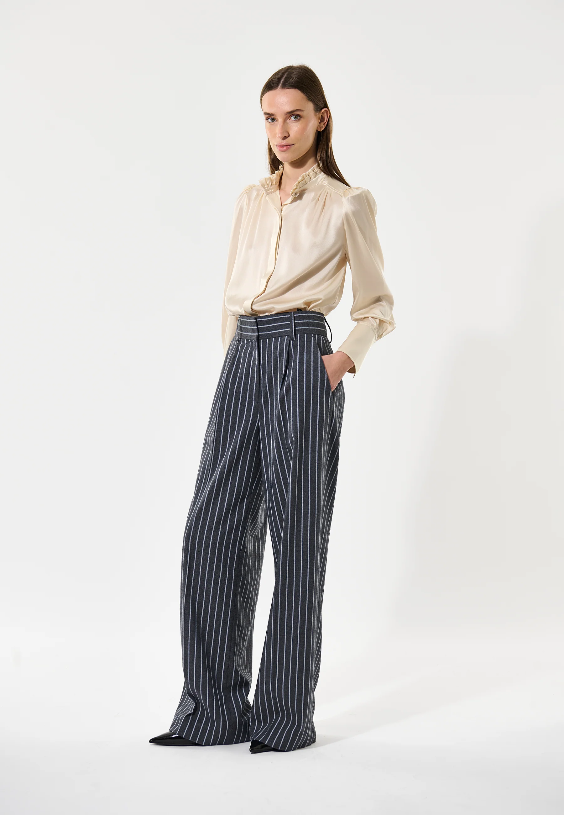 A double row of ruffles at the neck of this regular fit blouse give an added element of femininity that makes it a sophisticated and chic choice, made all the more luxurious in a hued satin silk. Detachable shoulder pads give soft structure to the puff sleeves whilst small tucks at the front and back add a little volume.