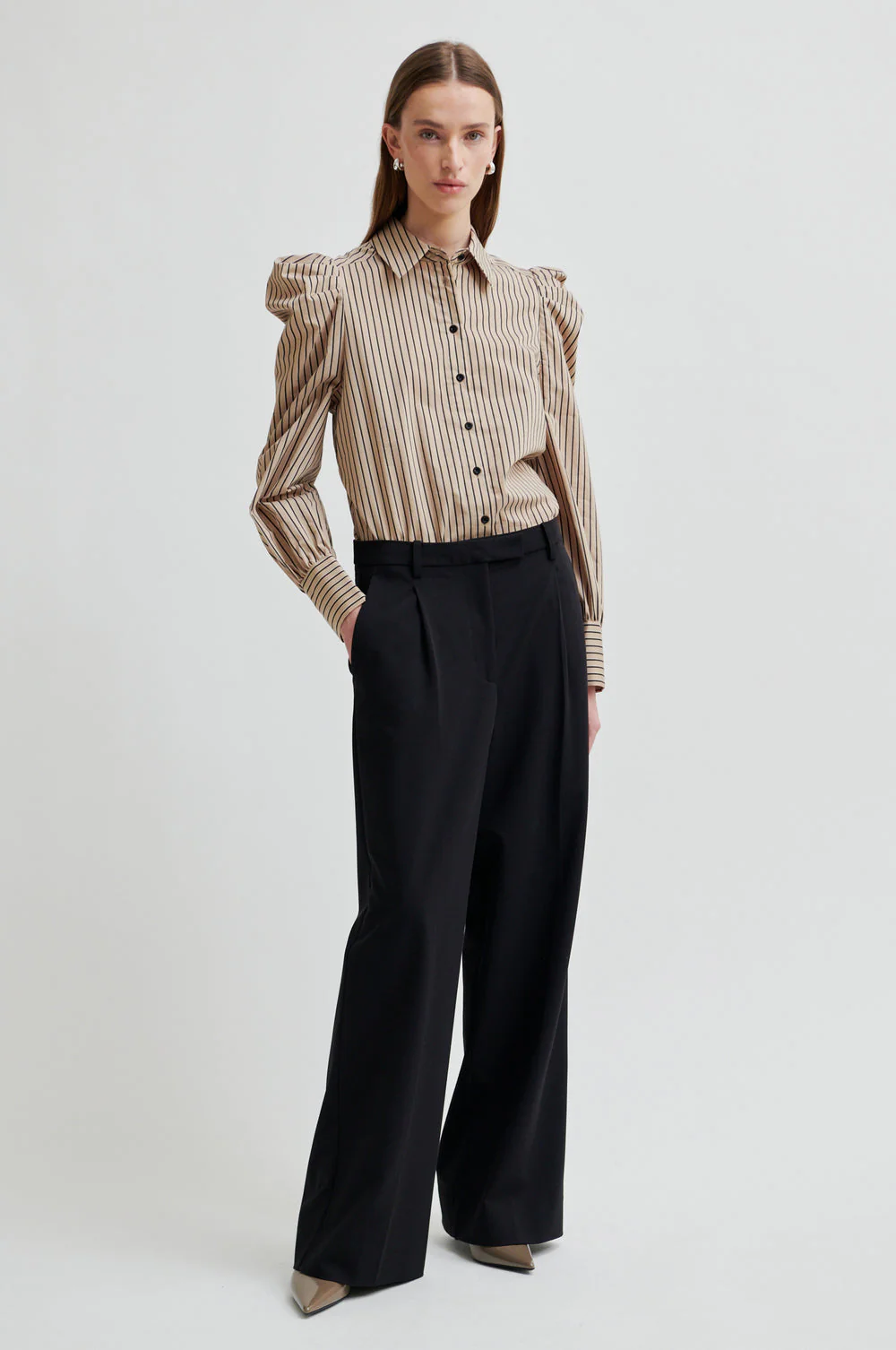 Second Female fitted striped shirt. The shirt is made in a smooth cotton-blend with all-over stripes. Featuring a regular collar and button-through fastening. Puffed shoulders and long sleeves with buttoned cuffs. Slim fit.