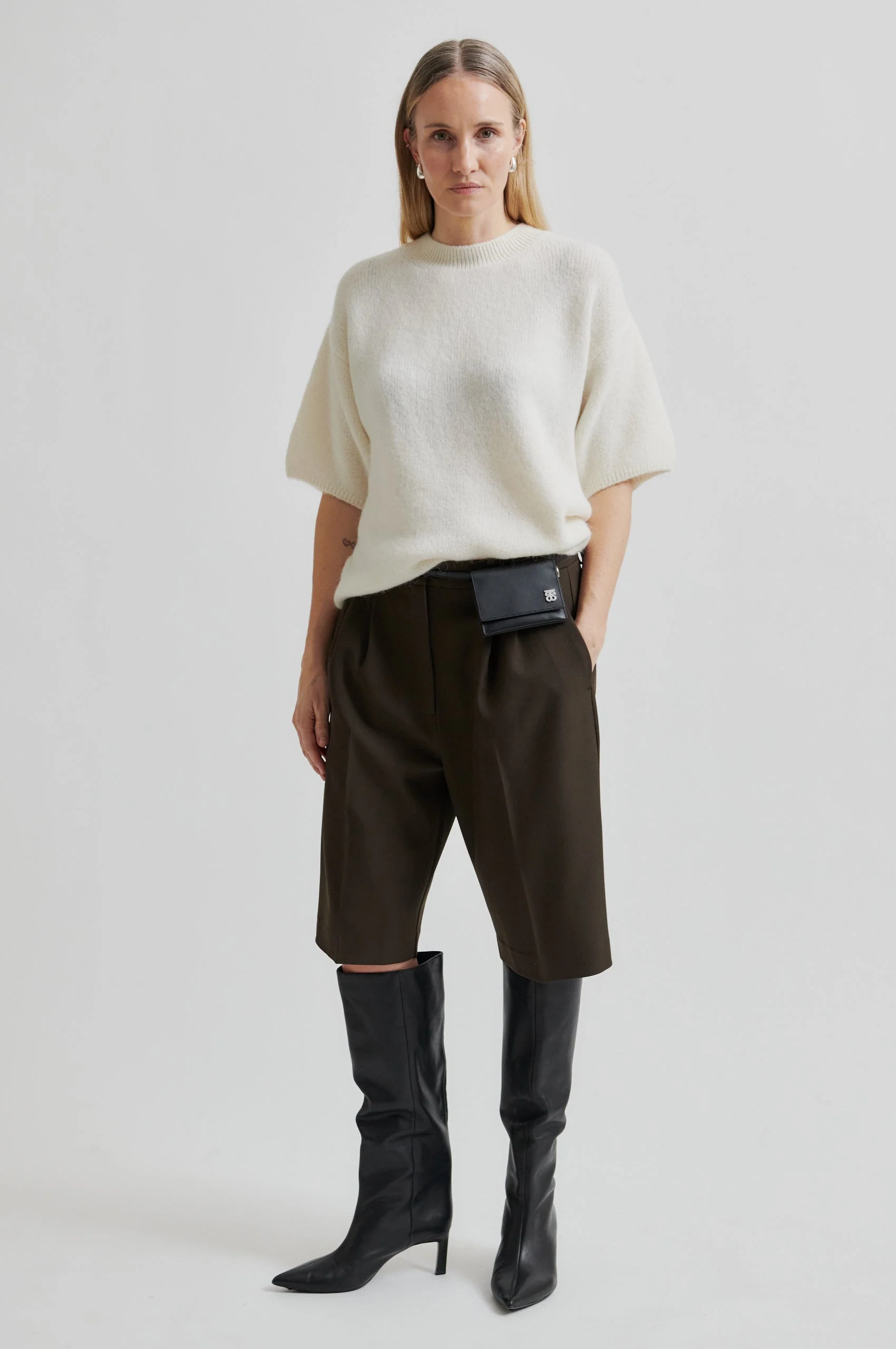 Second Female short-sleeved pullover. The pullover is made in a soft and stretchy alpaca blend. Featuring ribbed trim at neck, sleeve ends and bottom hem. Wide and relaxed fit.